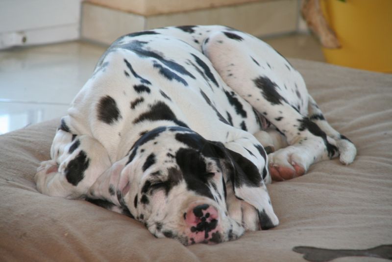 Die Pflege einer Deutschen Dogge ist relativ unproblematisch. Die Aufzucht eines solchen Riesen erfordert jedoch etwas mehr Erfahrung und Wissen. Die Dogge wird mit einem Gewicht von ca. 600 g bis 700 g geboren. Innerhalb des ersten Lebensjahres verhundertfacht die Dogge dann ihr Gewicht auf ca. 60 kg bis 70 kg. Für dieses enorme Wachstum braucht der Körper natürlich ausreichend Nährstoffe. Es dürfte für jeden klar sein, dass ein Billigfutter vom Discounter für die Aufzucht einer Deutschen Dogge wohl nicht in Frage kommt. Heute gibt es viele hochwertige Futtermittel, die alles beinhalten, was unsere Hunde an Nährstoffen und Mineralien benötigen. Das Futter ist in Größe, Form und Inhalt genau auf die Bedürfnisse einer heranwachsenden Deutschen Dogge ausgerichtet. Man sollte an dieser Stelle auch nicht sparen - das zahlt man später nur beim Tierarzt drauf, wenn Fehlentwicklungen und Mangelerscheinungen aufgrund falscher Ernährung auftreten.